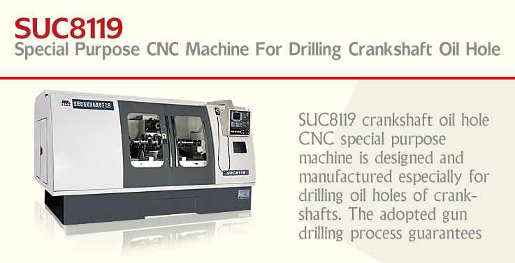 SUC8119 crankshaft oil hole CNC special purpose machine is designed and manufactured especially for drilling oil holes of crankshafts. The adopted gun drilling process guarantees high machining accuracy of oil holes. Main movement of the machine is controlled by Siemens 802C CNC system, while accessorial movement is controlled by hydraulic system. With features of high flexibility and convenient mould exchange, the machine is available for drilling various crankshaft oil holes with crankshaft length less than 1200mm.